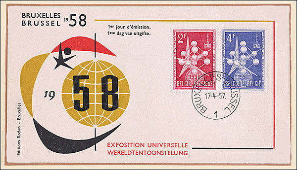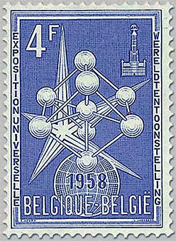 On its occasion, the famous Atomium, 102 m high, was built and consisted of 9 spheres with a diameter of 18 m each, connected to form an image of an iron atom, increased 65 billion times. This image appears on the commemorative stamp issued by the host of the exhibition, Michel No. 1091, Fig. 1. The entry fee was of 40 Belgium Francs, about 1 US$.