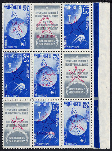 As a result, some "smart boys" from the General Directorate of the Post Office were asked to find a simple, cheap and quick solution to the problem. Under pressure, they came with a "genial one", namely to overprint the 2,593 unsold sheets of the 1957 "Artificial Earth Satellites" issue, which I dealt with in my previous article. This issue was "suitable" for the proposed purpose, as it appeared to be "A great victory of universal science and technique" (according to the vignette/Tab text of the issue), even though it underlined Romania's satellite position with respect to its great neighbor and "liberator" from the East. The Belgian "local color", which, incidentally or not, was red (the color of USSR flag), was used for overprinting. For this purpose, the very beautiful logo of the exhibition, which we show in Fig. 6, was "creatively used" by the Romanian post.