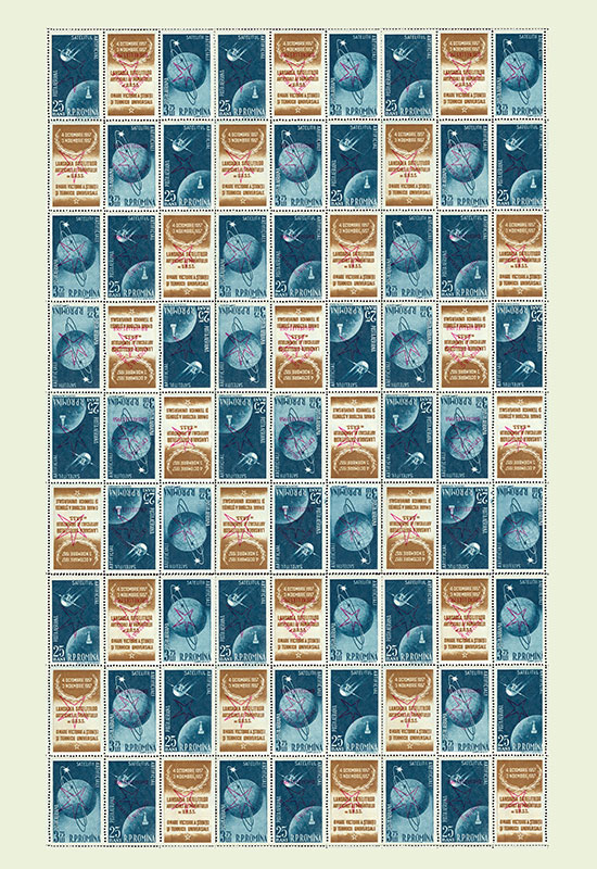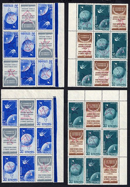 Fig. 7. CTOs obliterated with first day of issue cancellationThose who read my previous article can remember that the printed sheet of the Artificial Satellites I and II was relatively complex, because the lines 4, 5 and 6 were reversed relatively to the rest of others. Although all overprints have been applied in the same direction, it has resulted that some overprinted lines of the sheet appeared to have been rotated over the underlining images. In fact, of course, the images that were overprinted were reversed in relation to the overprints. To have an overview of the structure of the printed sheet, I present in Table 1 a schematic view of the whole printed sheet. This image will help me to correctly position the blocks to write this article. Of course, the table can serve to anyone to position/map any part of the respective triptics, this being the main reason why I compiled it.
