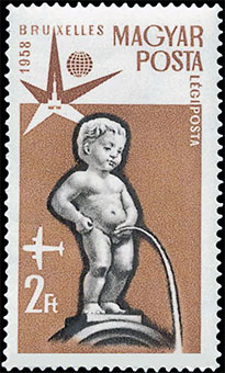 Fig. 2 . The Manneken Pis on an Hungarian stampThe so called cold war between the the two superpowers of the moment run peacefully in this exhibition, in two pavilions of the US and the USSR that were facing each other. The Soviets presented in the center of their impressive pavilion a copy of Sputnik I, as well as other technological and scientific achievements. The Americans answered by focusing on consumer goods, an impressive fashion show, as well as their new IBM 305 RAMAC computer, one of the latest models with electronic valves, but the first one with two hard disks, the whole equipment weighing a ton. In Fig. 3 and Fig. 4 I show the stamps of the Soviet pavilion (Mi. 2068) and of the American one (Mi. 724), issued by the respective countries on (or around) the April 17, 1958.