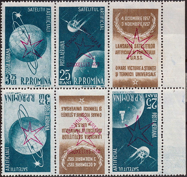 I owe to Mr. Cornelius Ionescu the opportunity to read the very interesting article of Eng. Mihail Popovici, entitled "A common, but rarely encountered variety of the philatelic issue ARTIFICIAL SATELLITES OF THE EARTH with the overprint BRUSSELS UNIVERSAL EXHIBITION 1958". This article appeared in the 1980 Philatelic Almanac, edited by Rompresfilatelia. From this article I learned that some "ultra-smart boys" (the term belongs to me) had the idea of introducing in the overprinting device sheets, which they had previously rotated horizontally by 180 degrees when compared with what was done legally earlier. Who they were, where they took the sheets, and how did they have access to the overprinting facility will probably remain a well-kept secret, even if the facts have been pardoned in the meantime by the law.